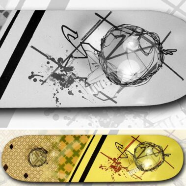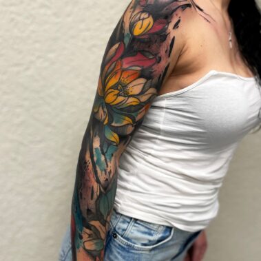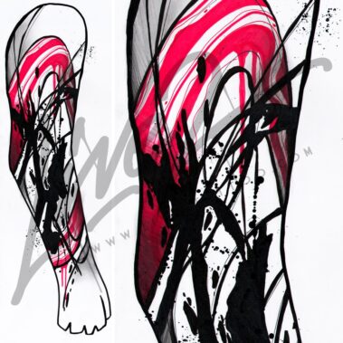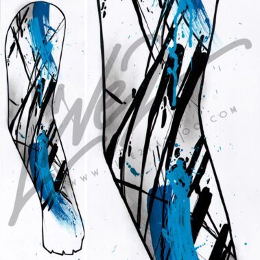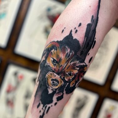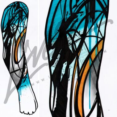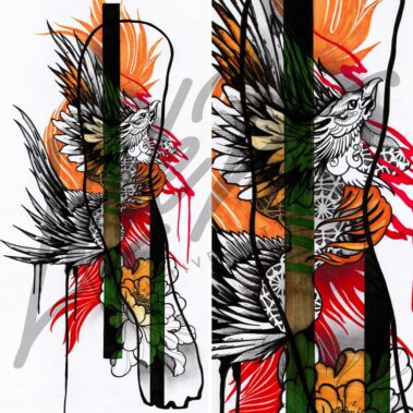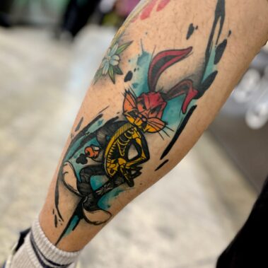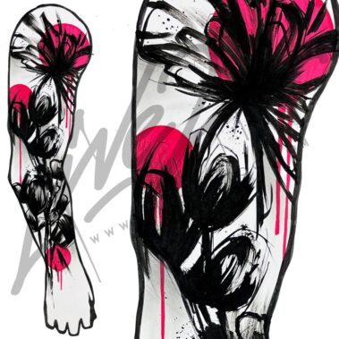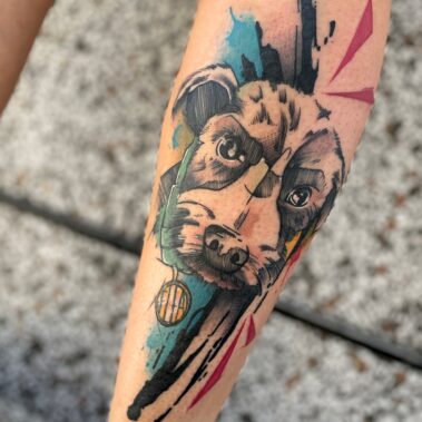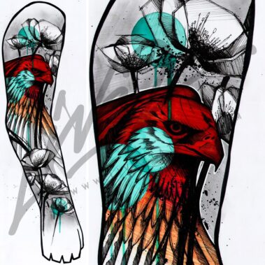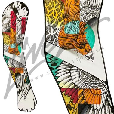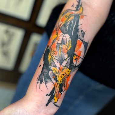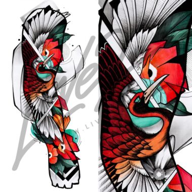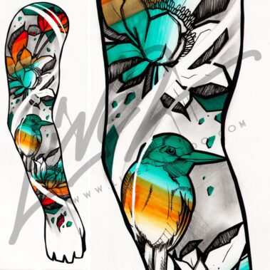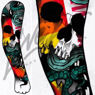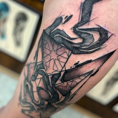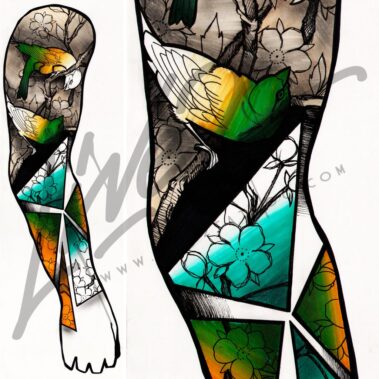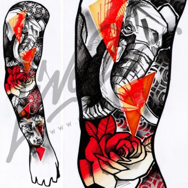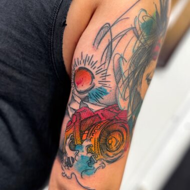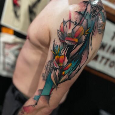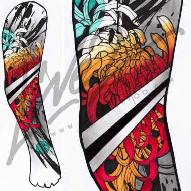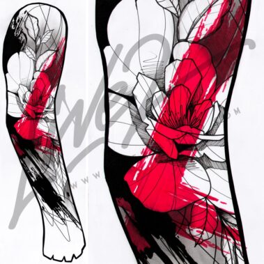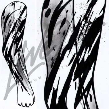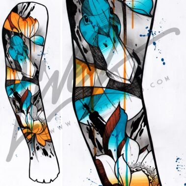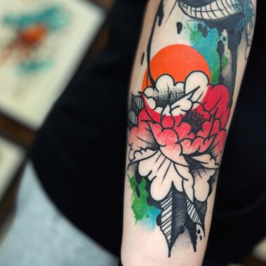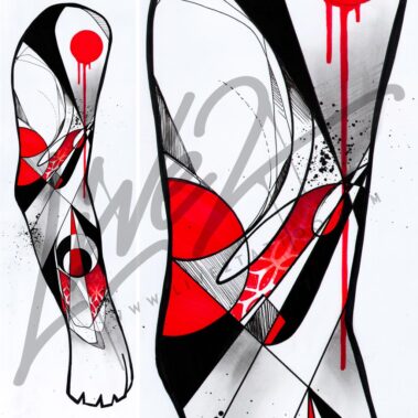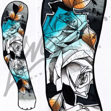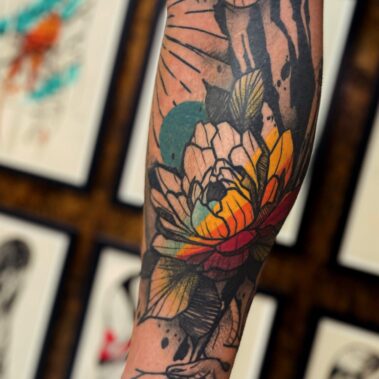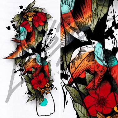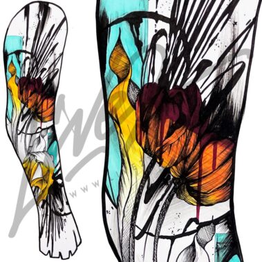 His relationship with Tattoo officially began in 2007, and his days as a graphic designer and graffiti artist are apparent throughout his work. His signature style combines graphic shapes, sketching technics, abstract forms, strict lines, graffiti textures and with an outstanding use of colour in a technique that resembles watercolour effect. The combination of these elements create a unique graphic abstract watercolor result.