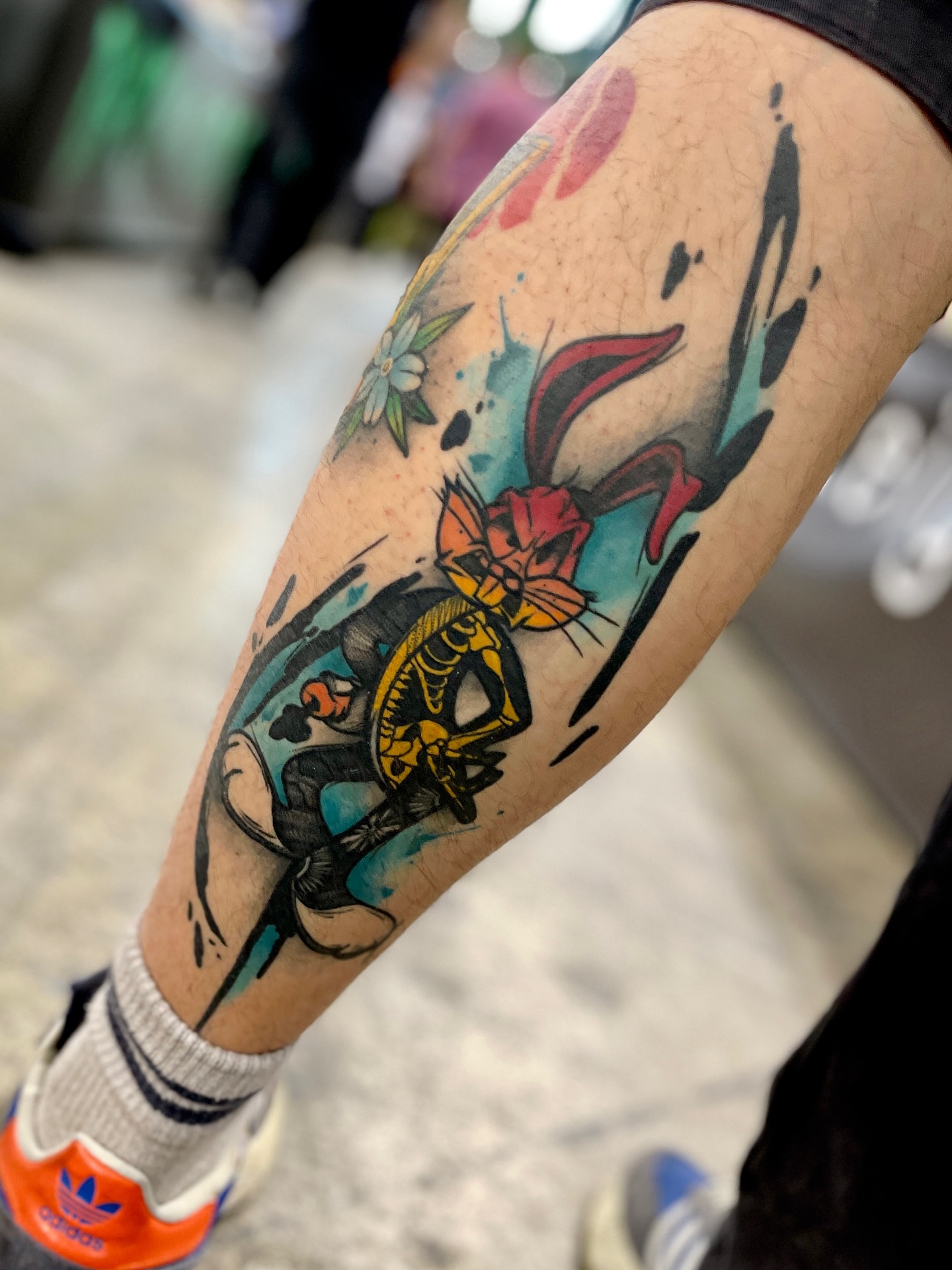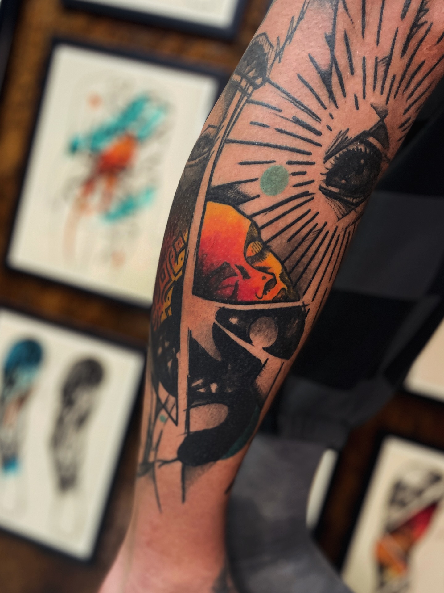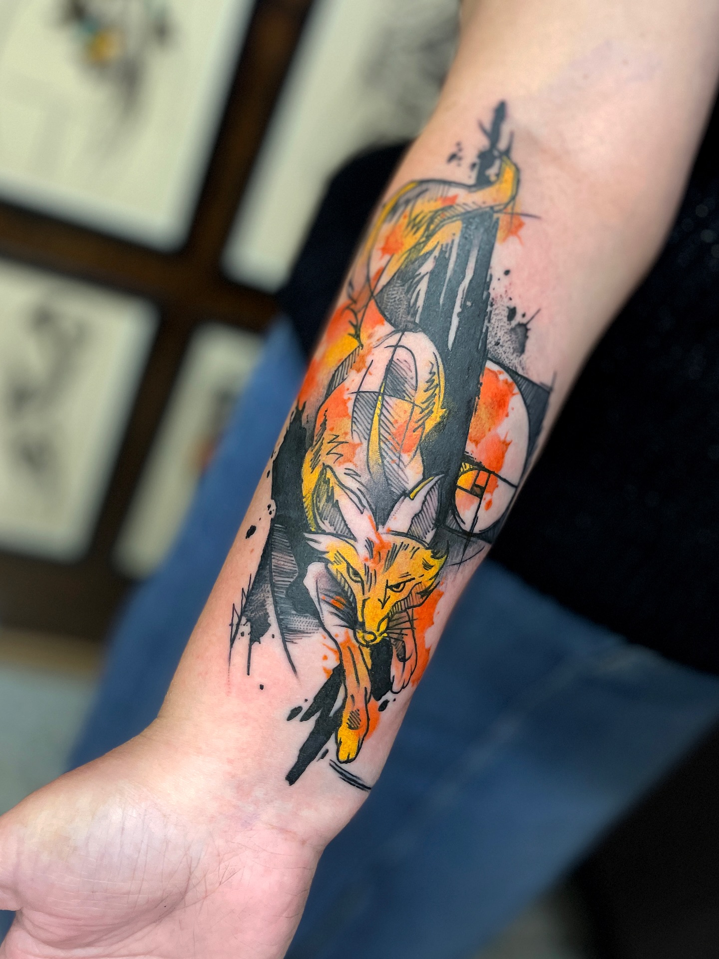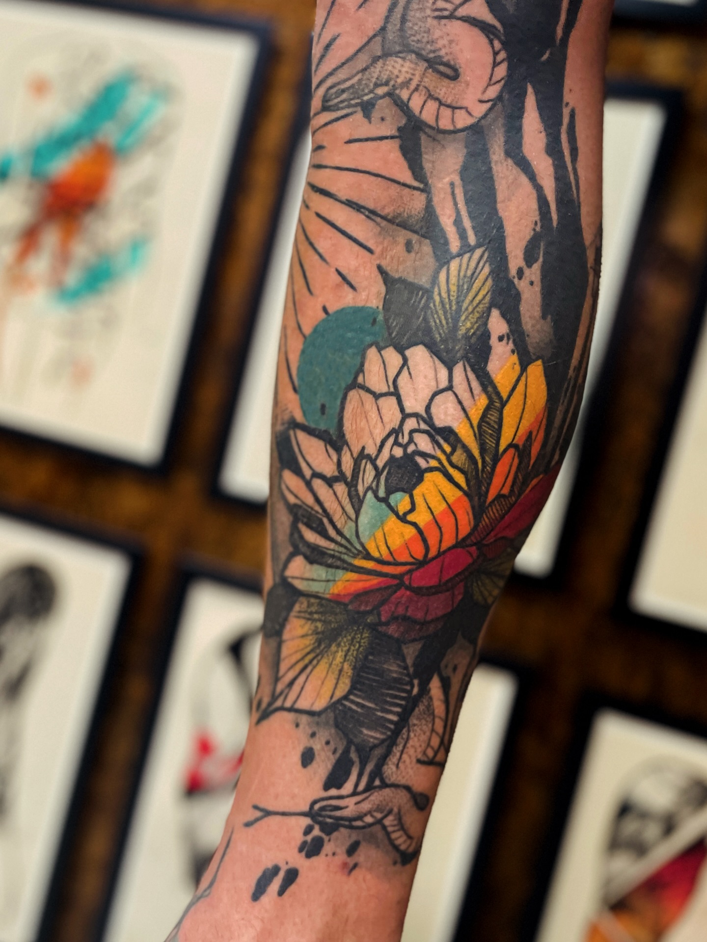 His relationship with Tattoo officially began in 2007, and his days as a graphic designer and graffiti artist are apparent throughout his work. His signature style combines graphic shapes, sketching technics, abstract forms, strict lines, graffiti textures and with an outstanding use of colour in a technique that resembles watercolour effect. The combination of these elements create a unique graphic abstract watercolor result.