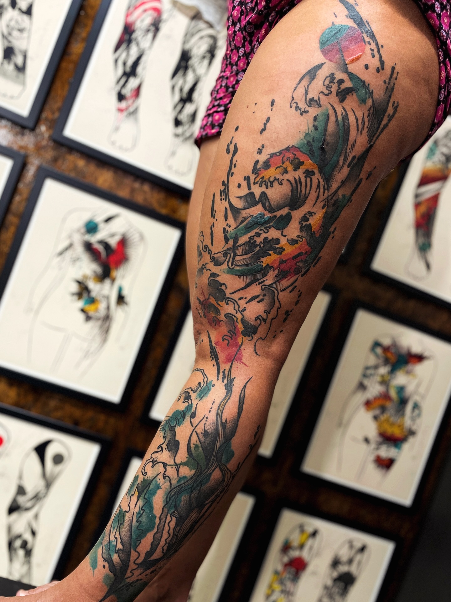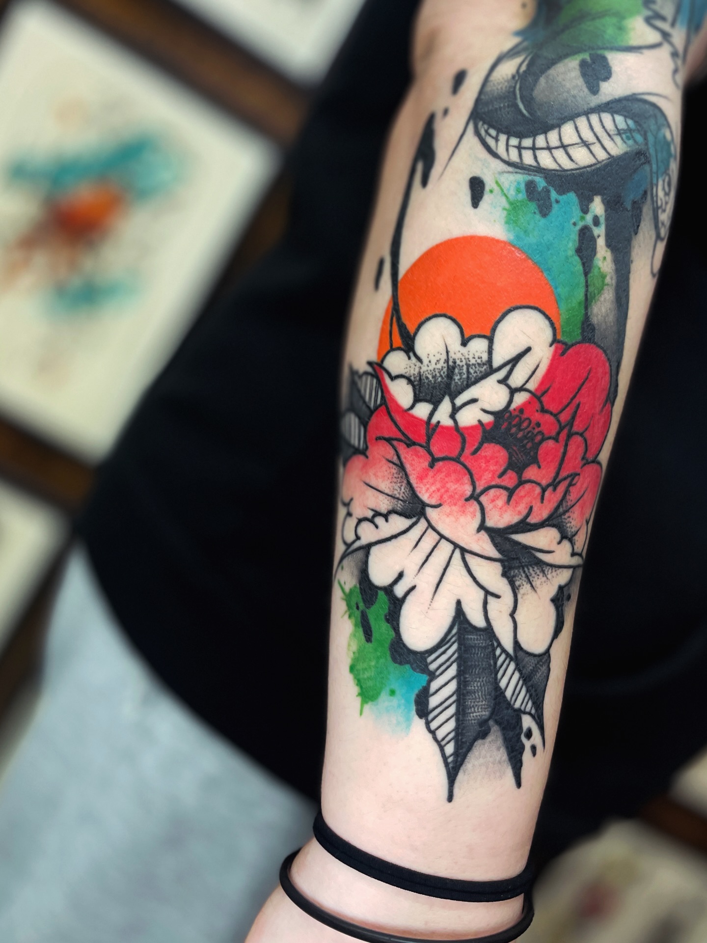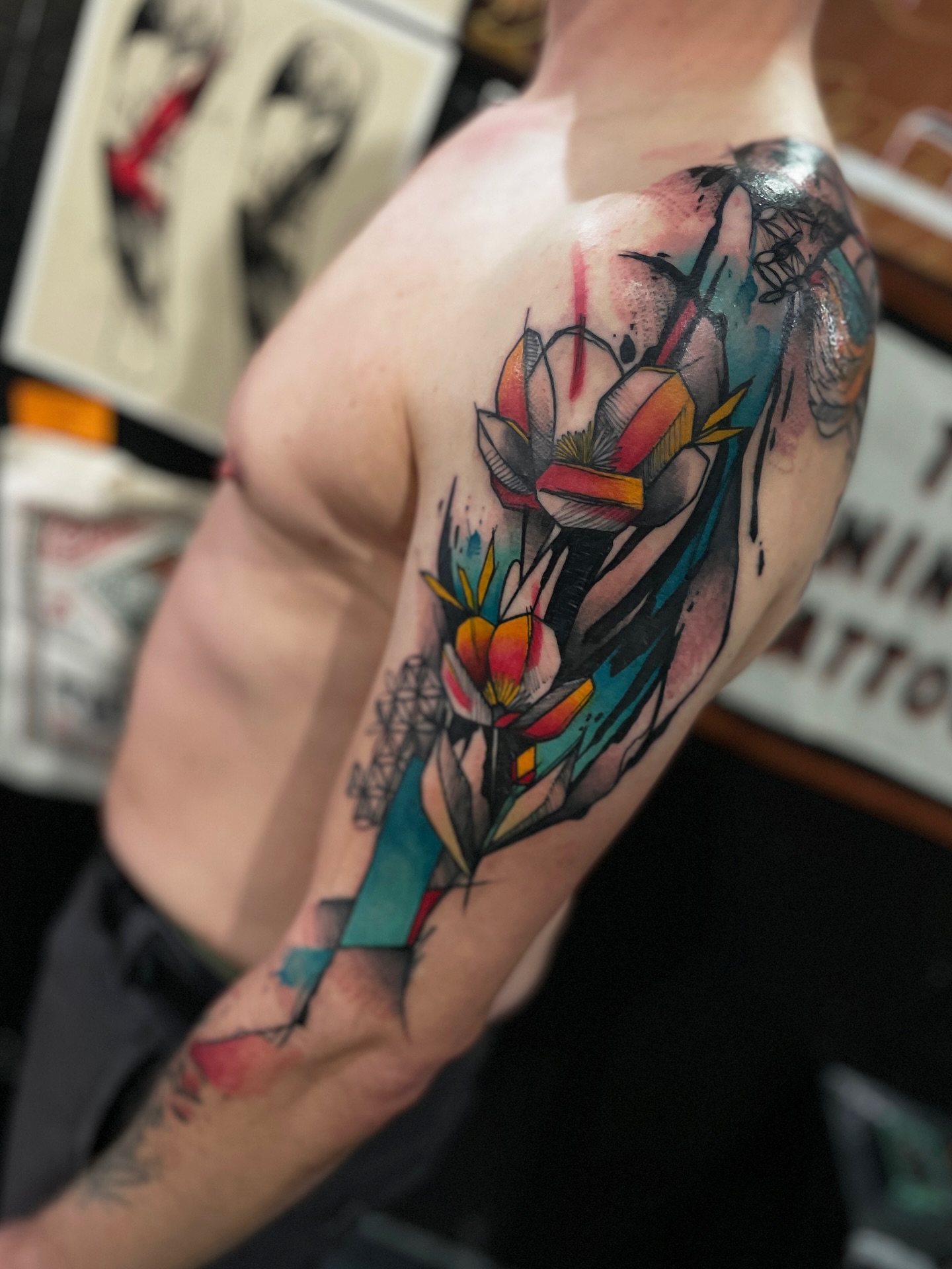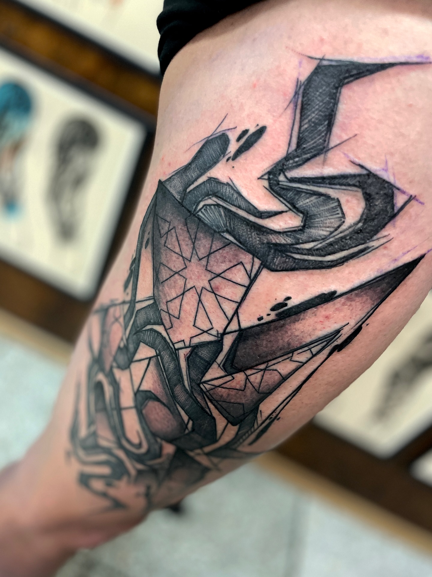 His relationship with Tattoo officially began in 2007, and his days as a graphic designer and graffiti artist are apparent throughout his work. His signature style combines graphic shapes, sketching technics, abstract forms, strict lines, graffiti textures and with an outstanding use of colour in a technique that resembles watercolour effect. The combination of these elements create a unique graphic abstract watercolor result.