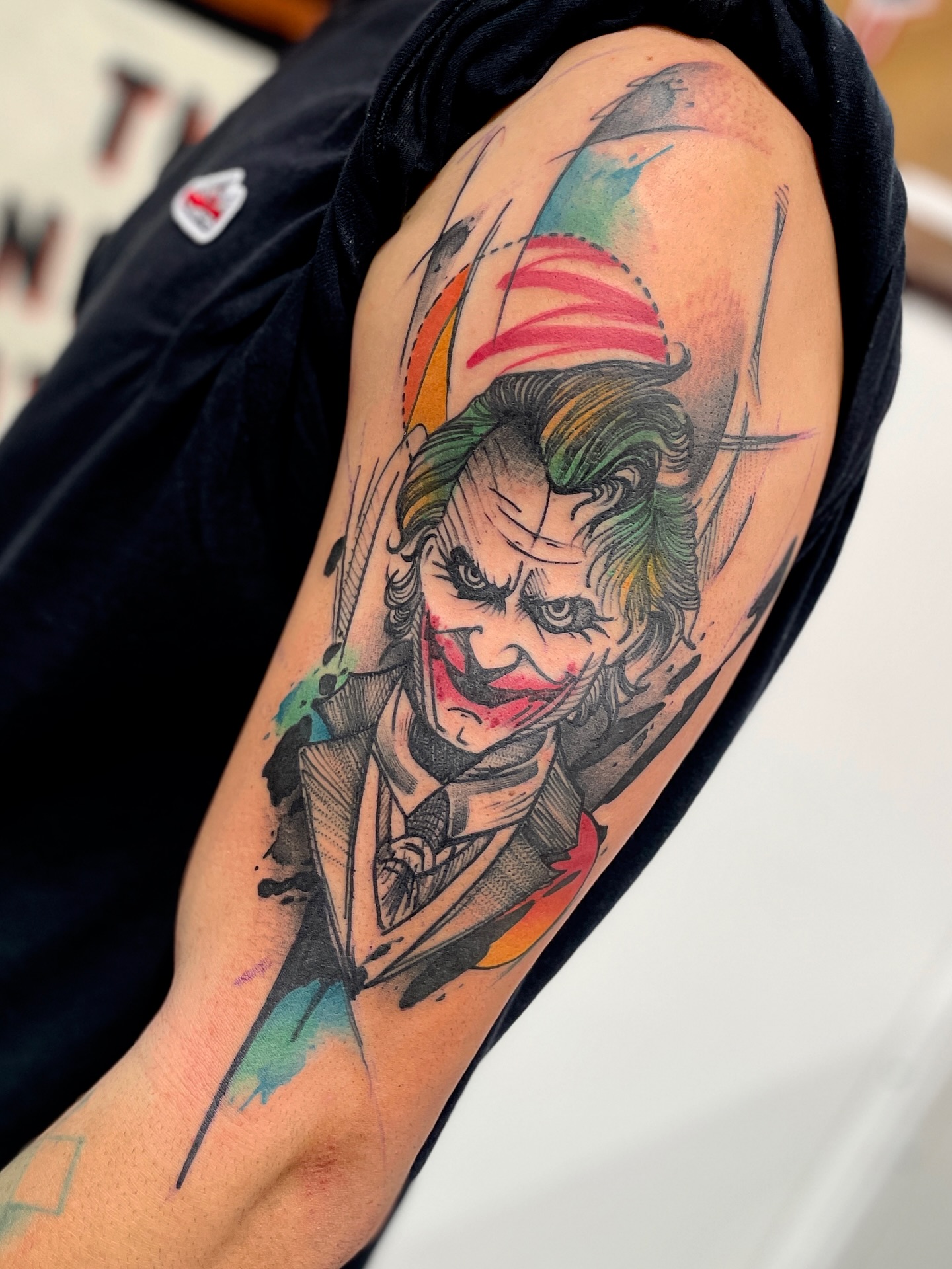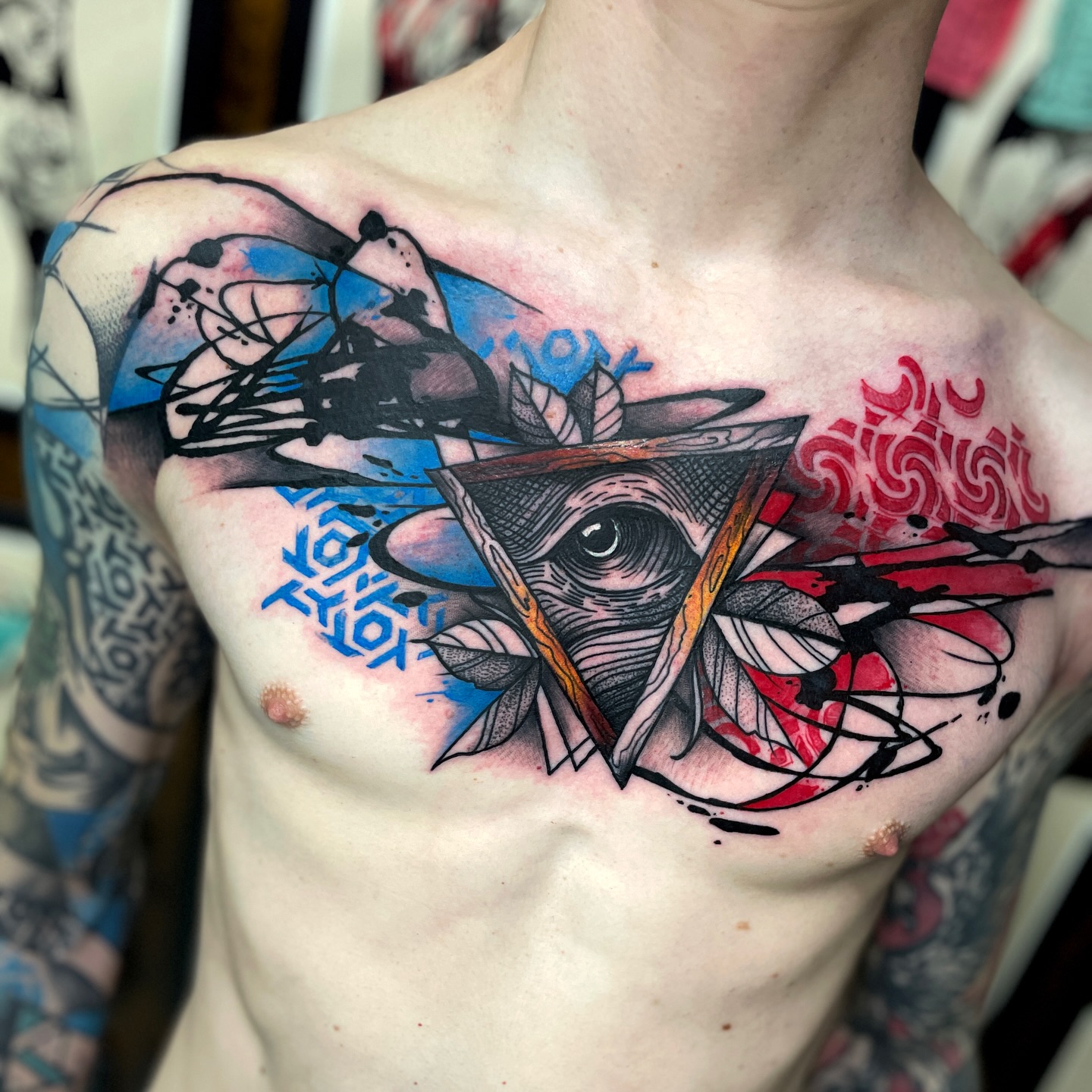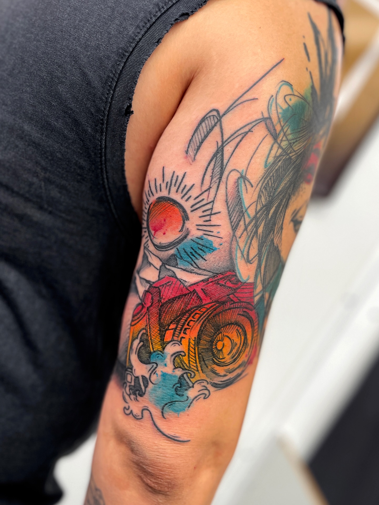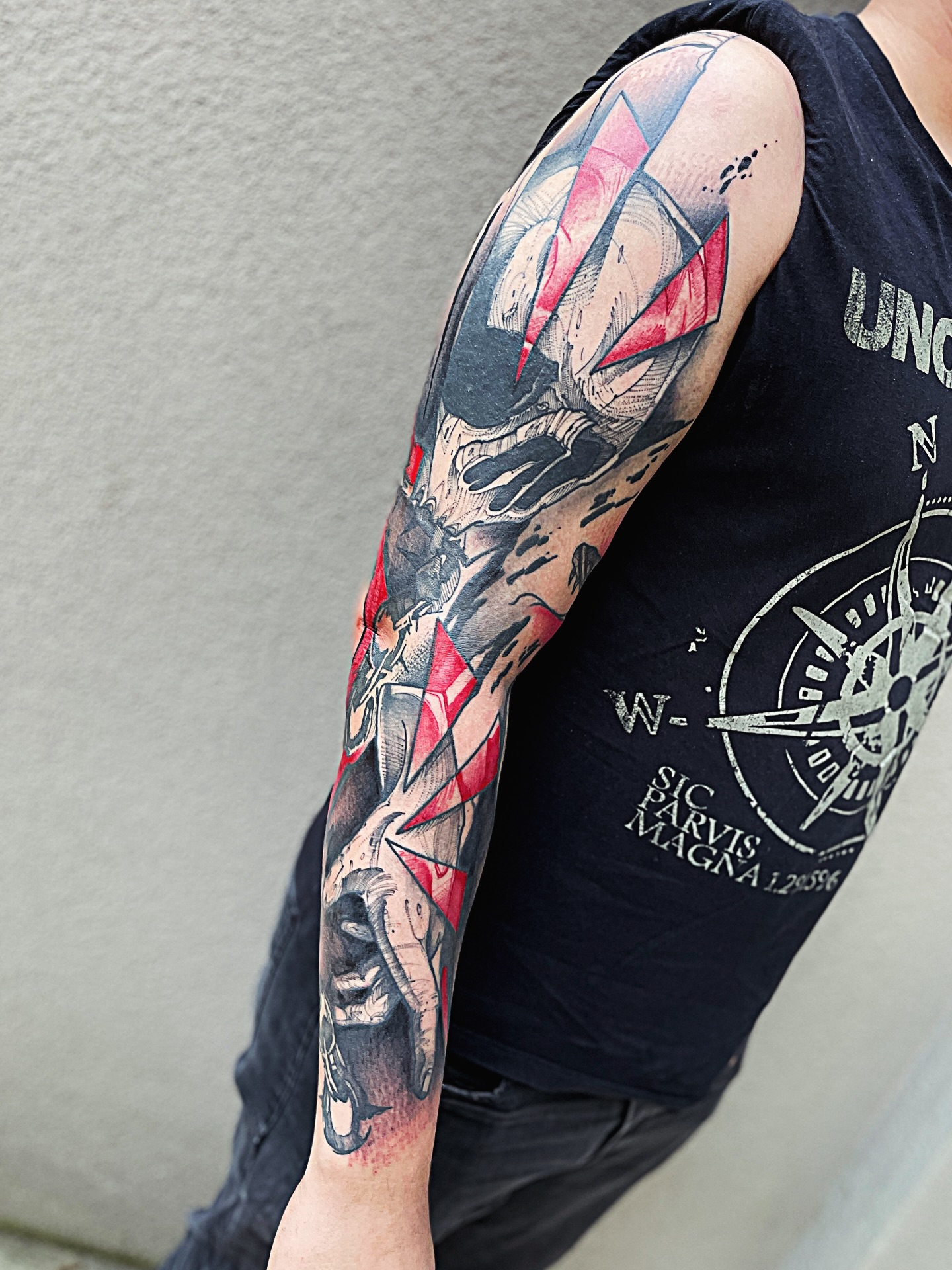 His relationship with Tattoo officially began in 2007, and his days as a graphic designer and graffiti artist are apparent throughout his work. His signature style combines graphic shapes, sketching technics, abstract forms, strict lines, graffiti textures and with an outstanding use of colour in a technique that resembles watercolour effect. The combination of these elements create a unique graphic abstract watercolor result.