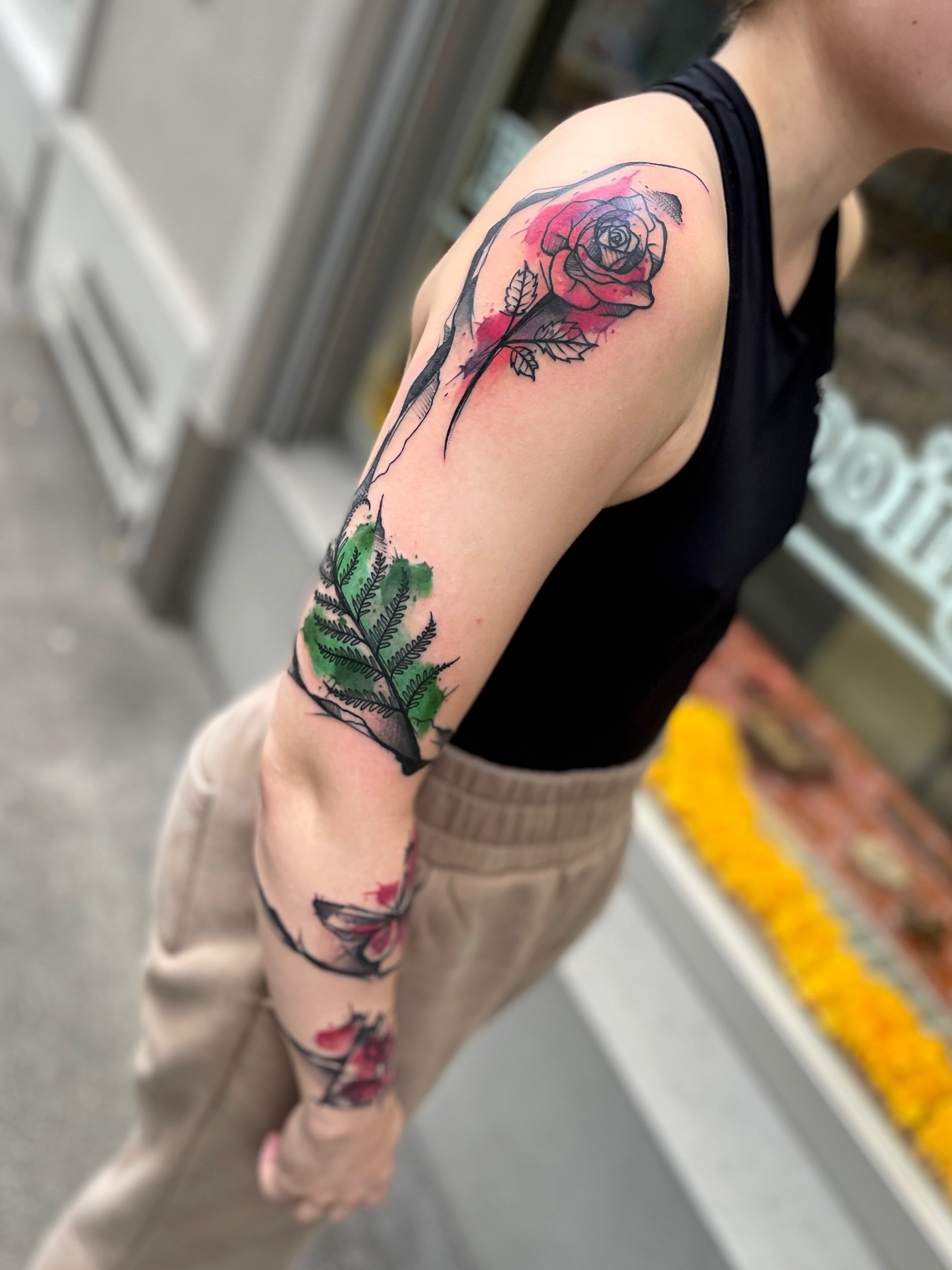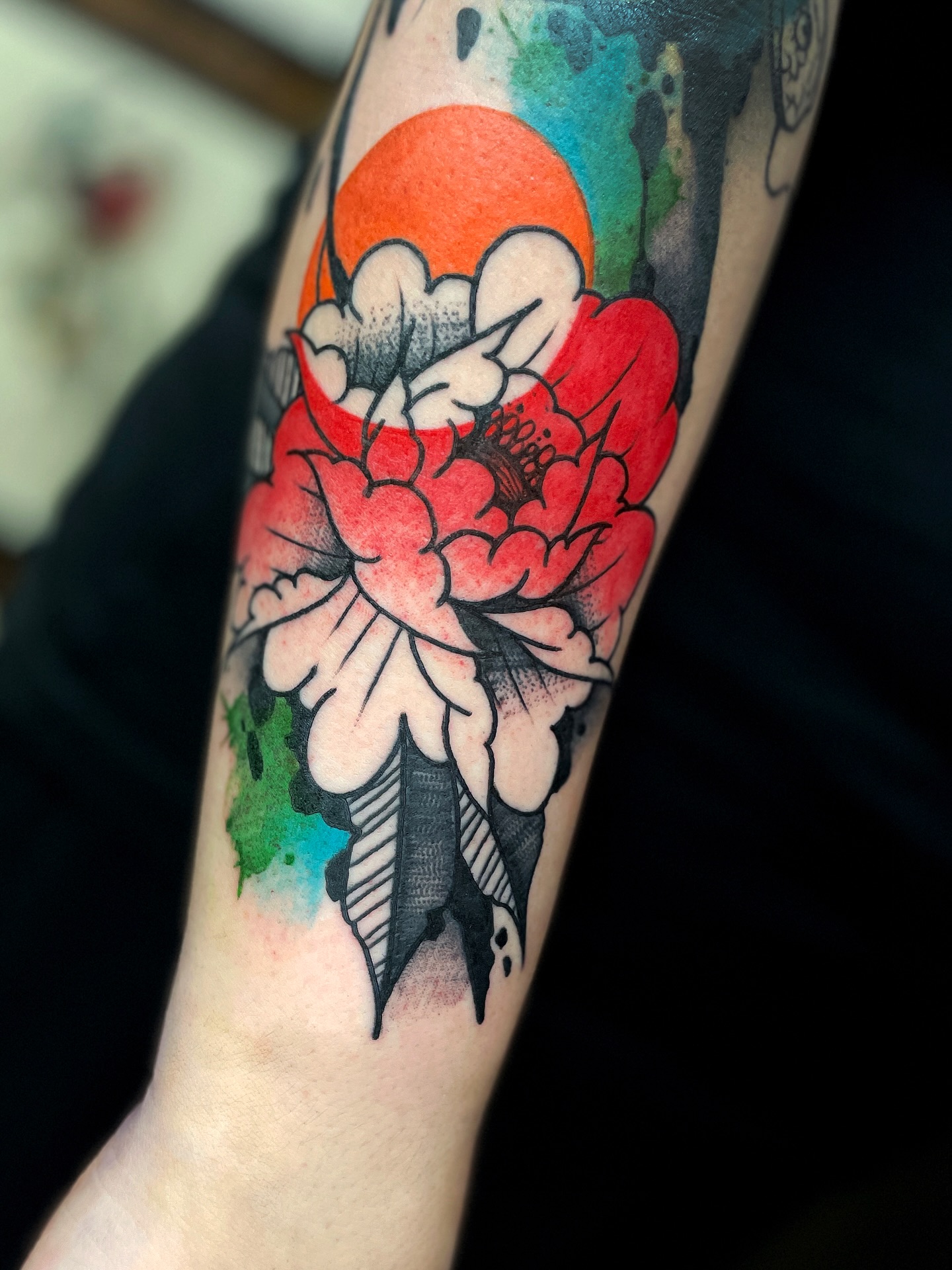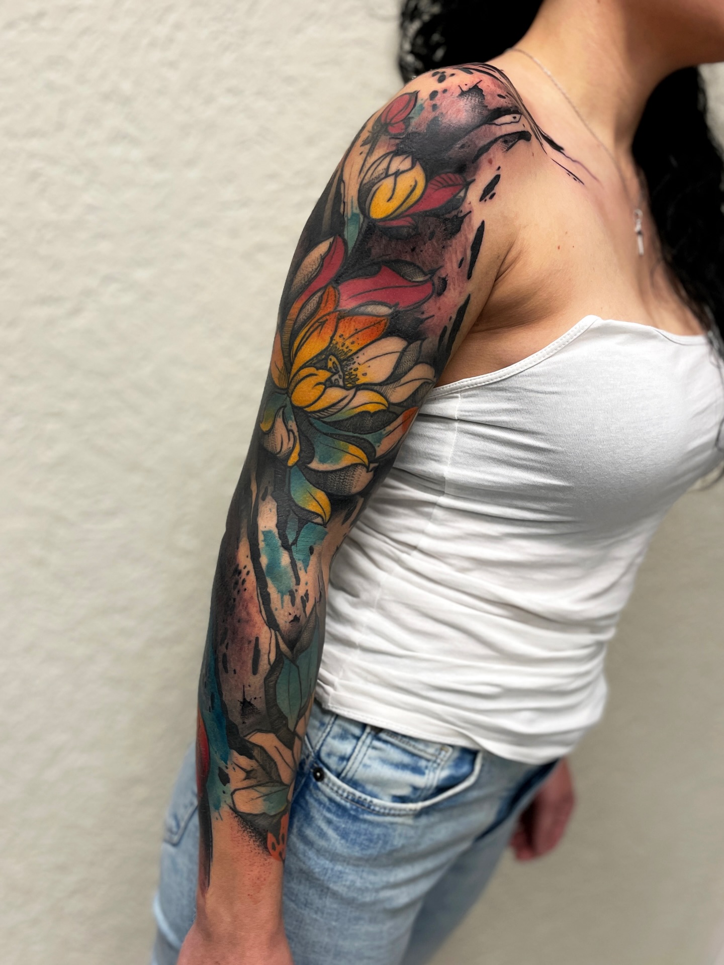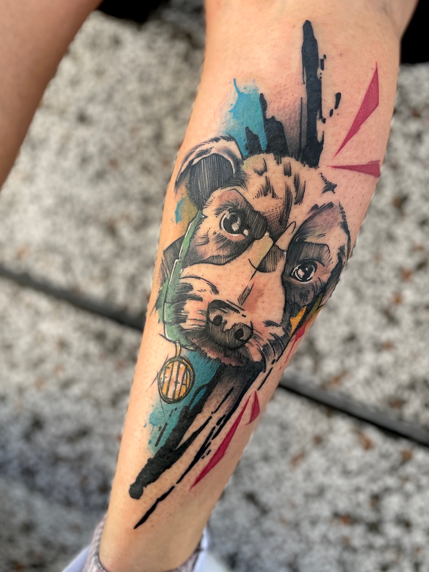 His relationship with Tattoo officially began in 2007, and his days as a graphic designer and graffiti artist are apparent throughout his work. His signature style combines graphic shapes, sketching technics, abstract forms, strict lines, graffiti textures and with an outstanding use of colour in a technique that resembles watercolour effect. The combination of these elements create a unique graphic abstract watercolor result.